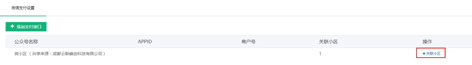 第四步:新增共享公众号之后,可同时共享该公众号对应的微信支付接口,如需使用该支付接口,可关联小区到该支付接口,如下图所示: